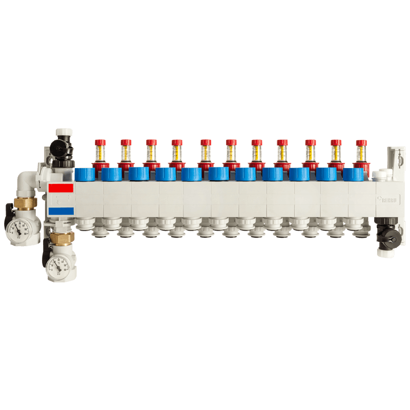 Полимерен колектор HKV P с дебитомери, с вътрешна резба DN 25 за 11 кръга на отопление. Подходяща за тръби RAUTHERM SPEED 16 mm.