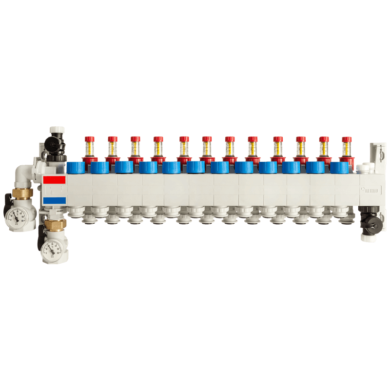 Полимерен колектор HKV P с дебитомери, с вътрешна резба DN 25 за 12 кръга на отопление. Подходяща за тръби RAUTHERM SPEED 16 mm.