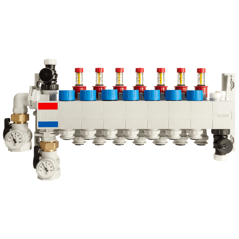 Полимерен колектор HKV P с дебитомери, с вътрешна резба DN 25 за 7 кръга на отопление. Подходяща за тръби RAUTHERM SPEED 16 mm.