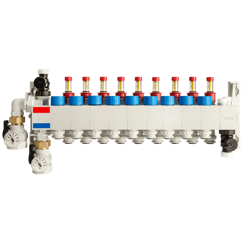 Полимерен колектор HKV P с дебитомери, с вътрешна резба DN 25 за 9 кръга на отопление. Подходяща за тръби RAUTHERM SPEED 16 mm.